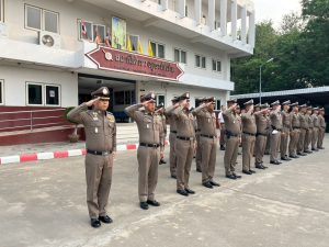 นำข้าราชการตำรวจในสังกัดร่วมเข้าแถว/ตรวจธงชาติ/เคารพธงชาติ/สวดมนต์/แผ่เมตตา/กล่าวบทปลงใจ/อุดมคติตำรวจกล่าวคำปฏิญาณตน